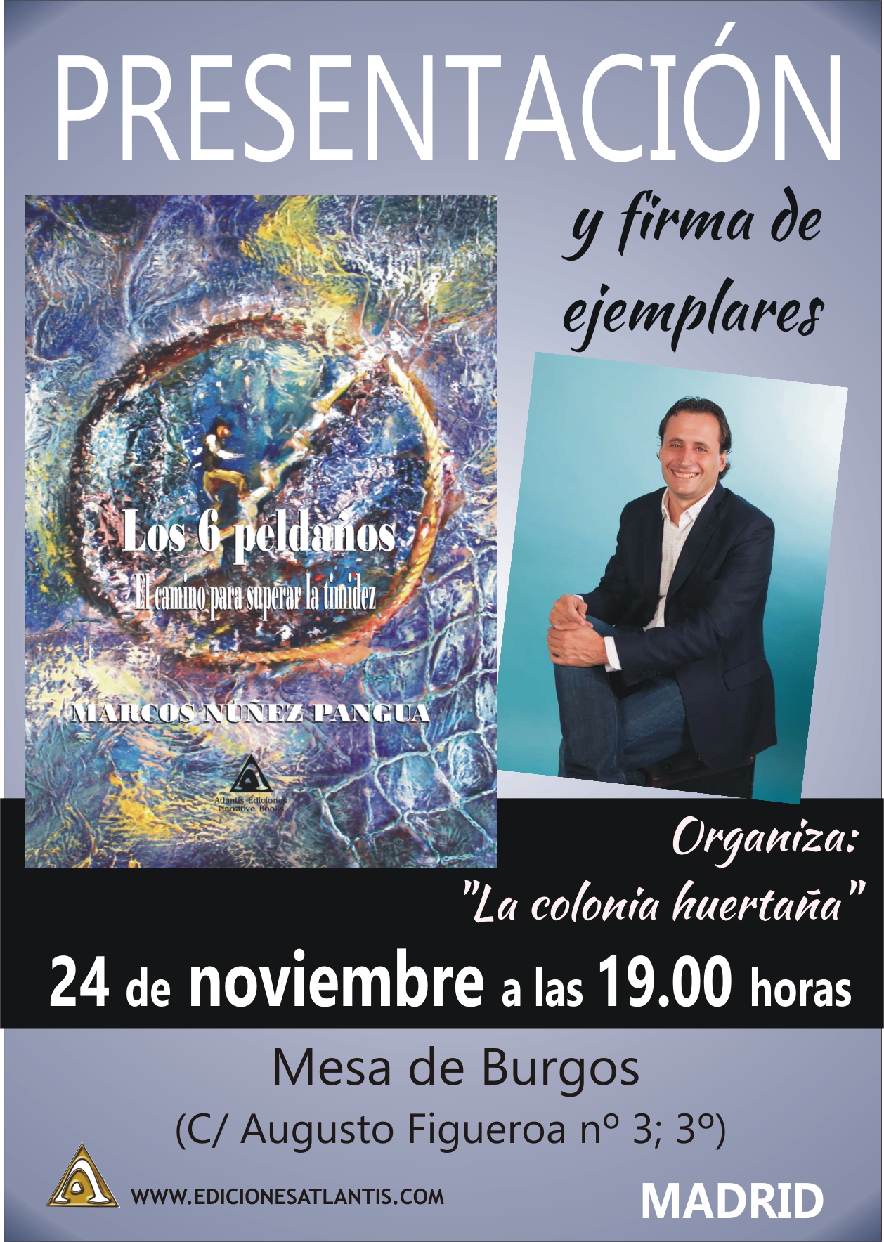 El sábado 24 de noviembre a las 19 horas presento en Mesa de Burgos (C/ Augusto Figueroa nº 3; 3º) mi tercer libro “Los 6 peldaños. El camino para superar la timidez”, publicado por Ediciones Atlantis.